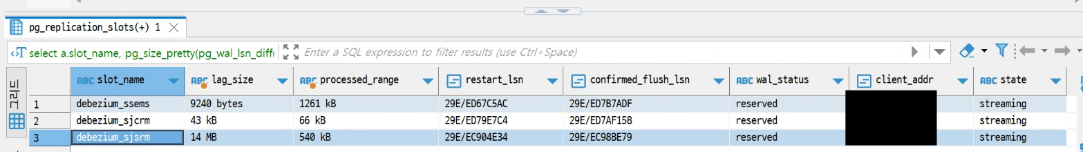 | confirmed_flush_lsn | replication slot을 사용하는 커넥터가 소비를 완료하고 flush까지 끝낸 LSN 위치 |